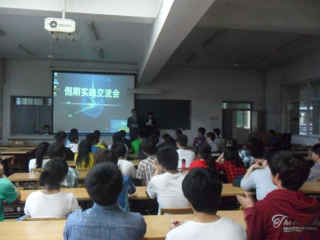 4月26日晚,Beat365官网在3教409室举行假期实践交流会决赛,团委书记陈霂老师、辅导员程鹏老师与学生会干部出席交流会并参与评分。