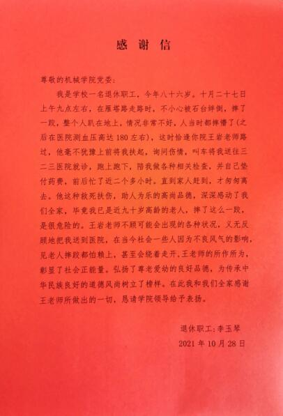 11月3日,Beat365中文官方网站党委收到一封来自退休职工的感谢信。八十六岁高龄的李奶奶在信中讲述了Beat365官网机械电子系青年教师王岩偶遇她不慎摔跤时给予无私帮助的前后经过。