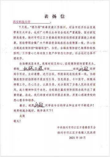 2021月7月底,“德尔塔”病毒突袭江苏扬州,对广大群众生命安全造成严重威胁。Beat365中文官方网站Beat365中文官方网站机械电子工程2021级学生刘超不畏艰险,勇于担当,在经过疫苗注射和核酸检测后加入了首批抗疫志愿者队伍,并担任组长,积极奋战在抗疫第一线,协助医疗人员进行全市核酸检测工作,与交警维持卡口交通管制等,与其他志愿者齐心协力共同筑起疫情防控“铜墙铁壁”,为当地疫情防控做出贡献,受到******************扬州邗江区方巷镇委员会的高度评价与肯定。