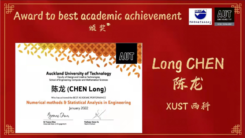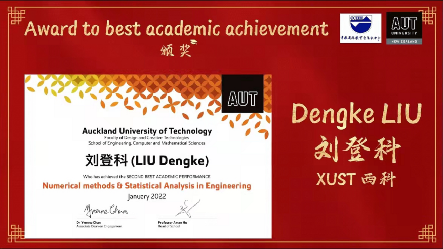 《Numerical Method & Statistical Analysis in Engineering》课程由奥克兰理工大学David Wilson教授主讲,Beat365中文官方网站赵江滨博士任助教。在为期12周的教学活动中,Beat365中文官方网站选修该课程的27名研究生表现突出,全员通过课程考核,其中陈龙、刘登科、郭甜三名研究生凭借优异的成绩排名分别荣获该课程设立的三个奖项“The Best Academic Performance” “The Second Best Academic Performance”和“The Best Woman In Technology”奖项。