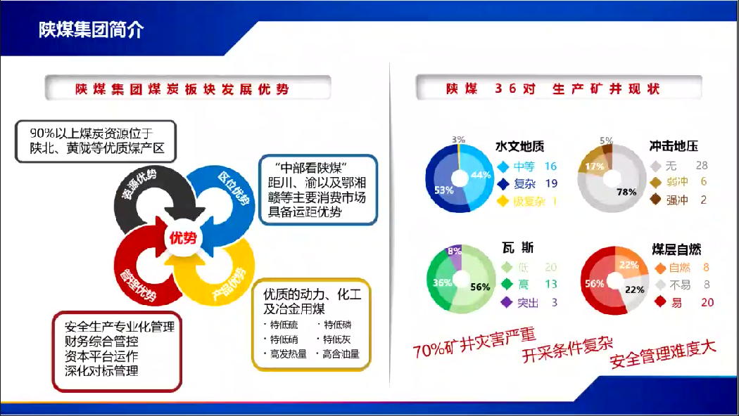陕煤集团副总经理王世斌做了题为“强化巷道系统‘三优两提高’建设推进煤矿实现安全高效绿色开采——陕煤集团煤矿巷道系统智能化建设的探索与实践” 的报告,重点介绍了陕煤在巷道掘进系统智能化建设方面所做的科研探索与现场实践经验。
