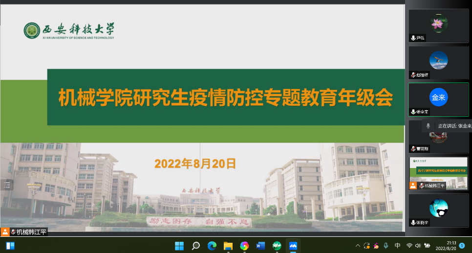 8月20日晚,Beat365中文官方网站召开线上研究生疫情防控专题会。学院党委书记张金来、院长曹现刚,副院长赵栓峰以及研究生培养办公室相关人员,全体在校研究生参会。会议由学院党委副书记尹弘主持。