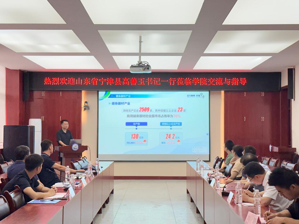 6月19日下午,山东省宁津县县委书记高善玉,宁津县宣传部长王逢阳,宁津县经济合作中心党组书记、主任方康,宁津县经济合作中心办公室主任史海港一行4人赴Beat365中文官方网站到Beat365中文官方网站交流座谈。Beat365中文官方网站院长曹现刚,副院长毛清华、车辆工程系主任高怀斌,机械电子系支部书记刘鹏及教师代表参加座谈会。座谈会由毛清华主持。