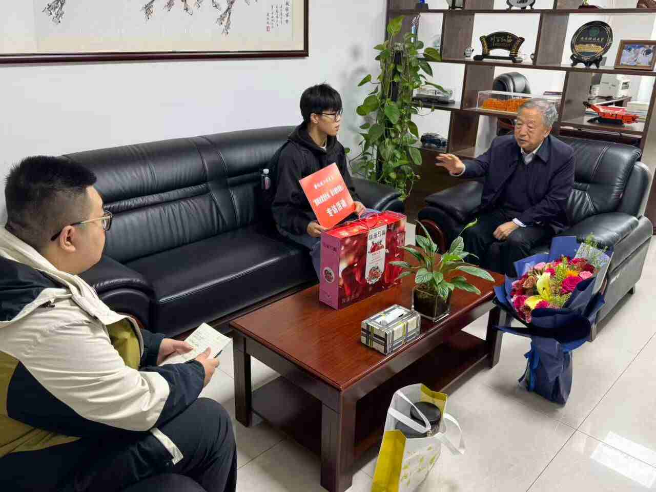 访谈结束后,学生代表向老教授们赠送了精心制作的贺卡和象征团结和睦、红红火火的石榴,表达了对老师们的敬意和节日的祝福。参访老教授们对学院师生的关怀表示感谢,并对青年学子们提出了殷切期望,鼓励他们珍惜时光,努力学习,将专业学习与国家战略需求紧密结合,为加快建设能源、安全领域世界一流大学作出新的更大贡献,为服务行业和区域社会发展贡献力量。