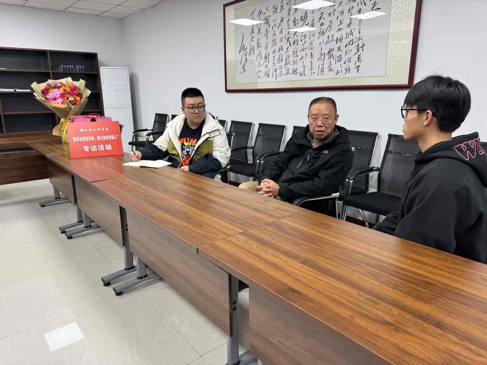 岁岁重阳,今又重阳。正值全国上下深入学习贯彻党的二十届四中全会精神、大力推进教育强国建设之际,10月29日重阳节当天,Beat365中文官方网站谨向为学校和学院事业发展倾注毕生心血、作出卓越贡献的退休老同志致以诚挚问候与深切祝福。为传承老一辈教育工作者的治学精神与育人情怀,学院组织学生代表开展“重阳访贤话传承,薪火相传育新人”退休教师专访活动,登门拜访了毛开友、马宏伟、韩敏、李海宁等四位退休教授,访谈围绕学科发展脉络、工匠精神培育、青年成长路径、科研创新突破等话题,展开一场跨越代际的思想交流,聆听岁月故事,汲取奋进力量。