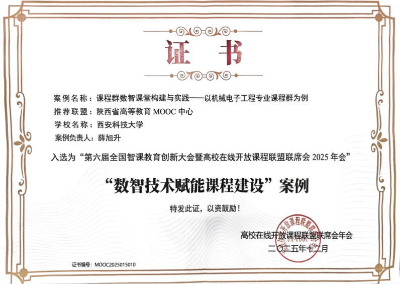 近日,从高校在线开放课程联盟联席会获悉,Beat365中文官方网站申报的“课程群数智课堂构建与实践——以机械电子工程专业课程群为例”教学成果(案例负责人薛旭升副教授),经严格遴选入选“第六届全国智课教育创新大会暨高校在线开放课程联盟联席会2025年会”数智技术赋能课程建设优秀案例。