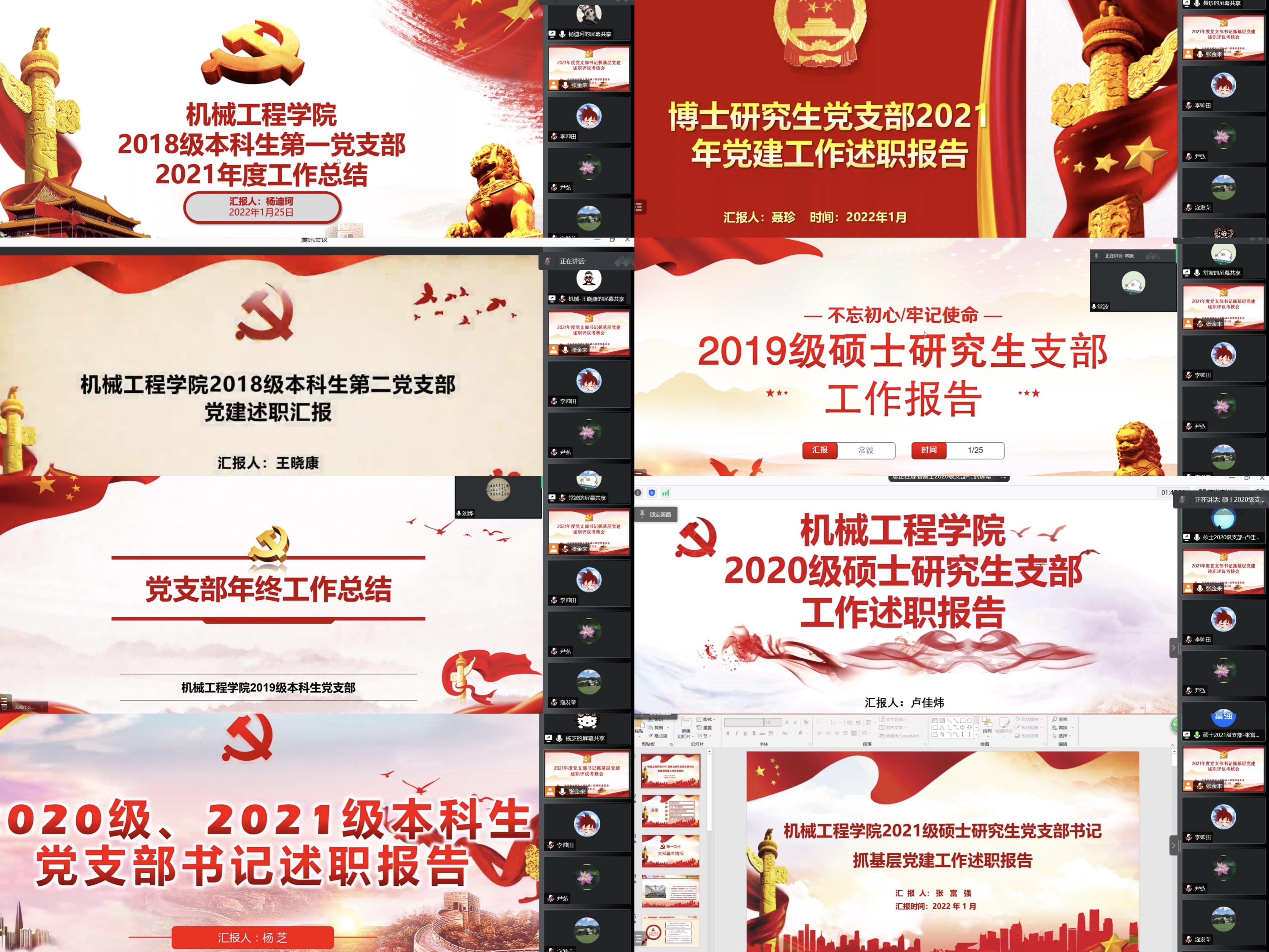 会上,14名教工、学生党支部书记按照学院党委对考核工作的统一部署和要求,聚焦贯彻落实习近平新时代中国特色社会主义思想、关于教育的重要论述、全国教育大会、全国高校思想政治工作会、学校思想政治理论课教师座谈会和第27次全国高校党建工作会议精神,以及《2021年全省教育系统基层党建重点任务》,紧扣基层党建重点任务,分别对2021年政治理论学习、落实基层党建工作重点任务,重点围绕严肃党内政治生活,强化政治功能,支部党史学习教育开展情况;推进习近平新时代中国特色社会主义思想“三进”,落实立德树人根本任务,以实际行动做到“两个维护”情况;推动“三会一课”和谈心谈话、主题党日等制度落实,推进党建工作和立德树人教书育人工作深度融合;“样板支部”培育和创建工作、疫情防控等任务中发挥党组织战斗堡垒作用和党员先锋模范作用情况、规范党员发展和教育管理等方面以及存在的主要问题、下一步努力方向等方面进行了线上述职。各支部联系院领导结合实际工作分别对各支部工作进行了点评。