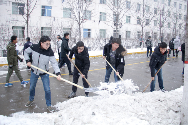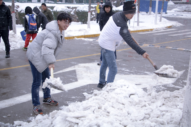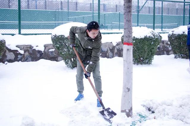 同学们不畏严寒、踏着皑皑白雪陆续来到扫雪区。大家齐心协力,默契配合,铲的铲、推的推、扫的扫,干的热火朝天,不亦乐乎,忙碌的身影构成了一道亮丽的风景线。