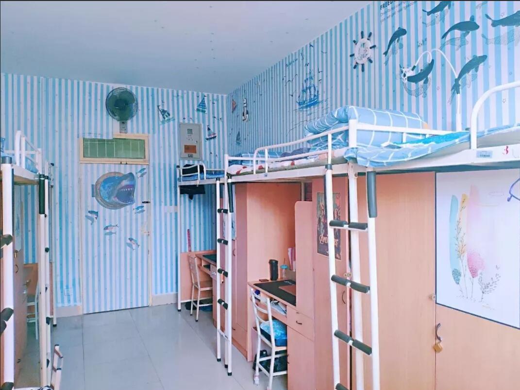 9-410 结合了大海与蓝天意义的宿舍,色彩纯美,线条规则,装饰手法鲜明,全宿舍装饰采用北欧风格,色彩明亮,沉稳大气。