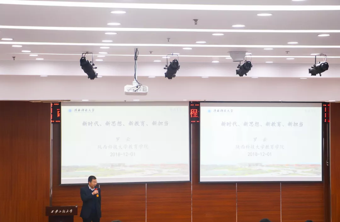 第一位是陕西科技大学特聘教授,教育学院副院长罗云教授,他的报告主题是“核心价值观与核心素养:大学生建功立业新时代的使命与担当”。主要为同学们介绍了新时代、新思想、新教育、新担当。最后提出了对当代大学生的十点要求:1有理想;2有道德;3有知识;4有能力;5有爱心;6有品位;7有激情;8有口才;9有形象;10有身体。
