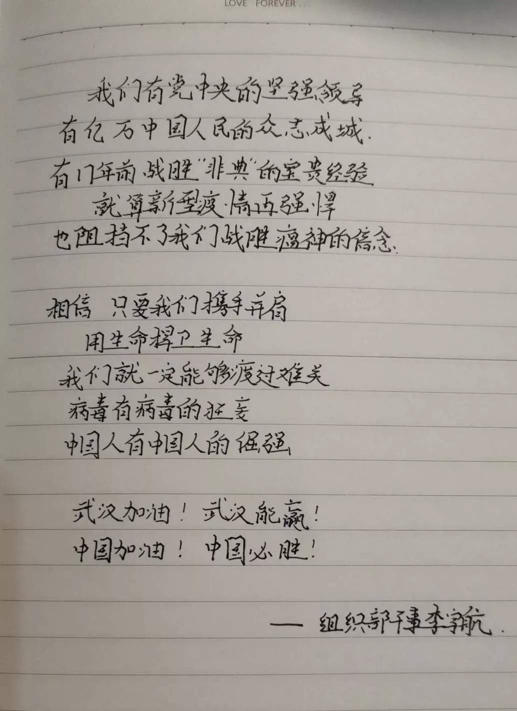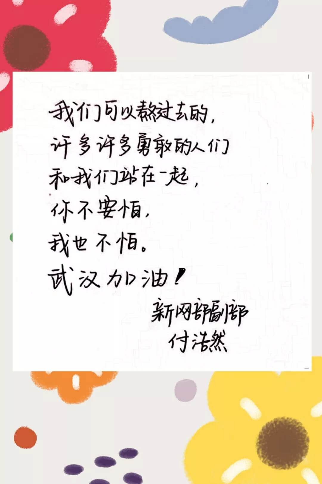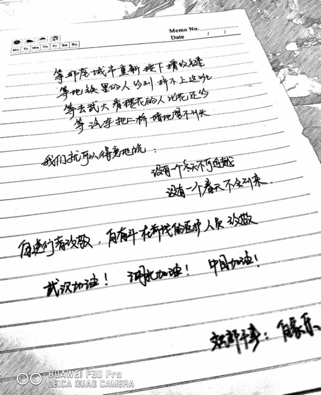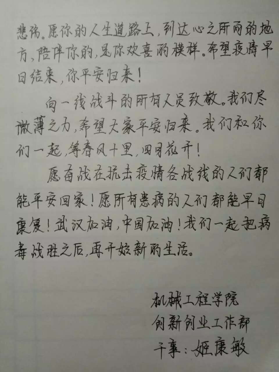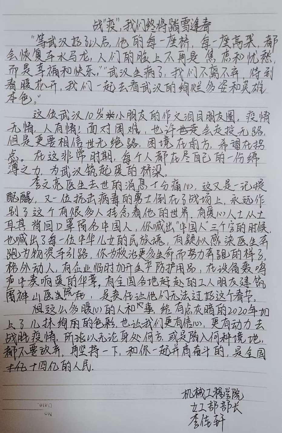 提到武汉,你想起的是“黄鹤一去不复返”的黄鹤楼,还是三四月间武大烂漫的樱花,亦或是热气腾腾唇齿留香的热干面? 然而,这个春节我们说起武汉,更多的是谈论一串串冰冷的数字,一场来势汹汹的肺炎疫情。 一方有难,八方支援。在此危难之际,Beat365官网机械学子也与祖国同呼吸,以赤忱之心,为武汉献上最诚挚的祝福。 在这场战“疫”中,我们每个人都是战士。我们或许无法成为奋战在一线的白衣天使,但是我们也可以用自己的方式为他们加油,为武汉加油。