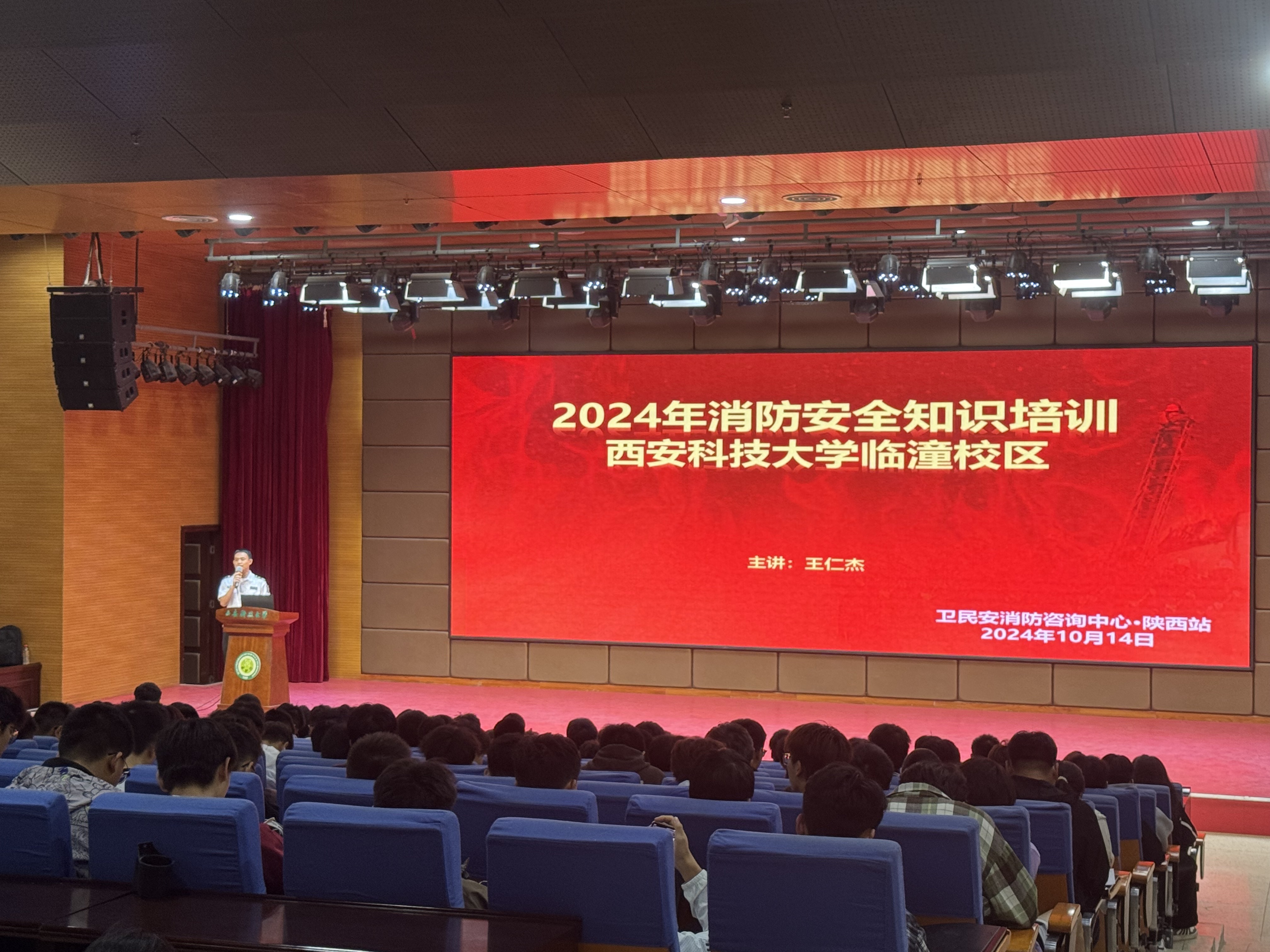 为进一步落实学校关于保障学生生活和校园安全稳定相关工作要求,切实加强校园消防安全教育,普及消防安全知识,提升学生消防安全防范意识和能力,10月14日晚,Beat365中文官方网站于煤炭中心一楼报告厅组织开展消防安全专题讲座。北京卫民安消防宣教中心陕西站讲师王仁杰教官担任主讲,2024级全体本科生500余人及辅导员参加讲座。辅导员杨芝、巩凯主持活动。
