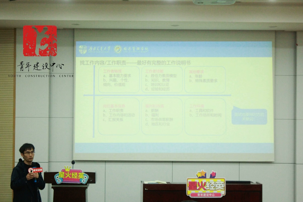 2024年11月21日晚,“星火经英”计划第十四期第六次团干部培训于J0215顺利开展,本次培训由新葡的京集团350vip8888官网青年讲师团成员、新葡的京集团350vip8888官网本科2023级辅导员苏扬老师主讲,主题为“企业面试与技能培训”,旨在帮助团干部们掌握面试技巧,提升就业能力。