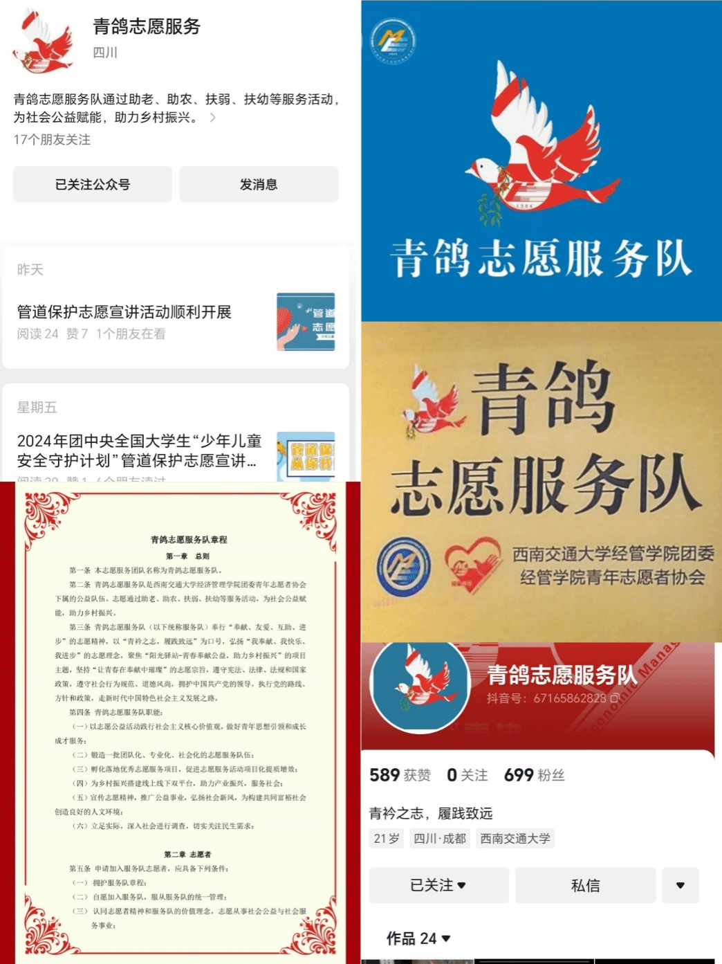 青年志愿者协会高度重视组织建设,2024年新增志愿者人数达到本科新生人数的100%,目前在团省委“志愿四川”志愿服务平台注册人数2683人。