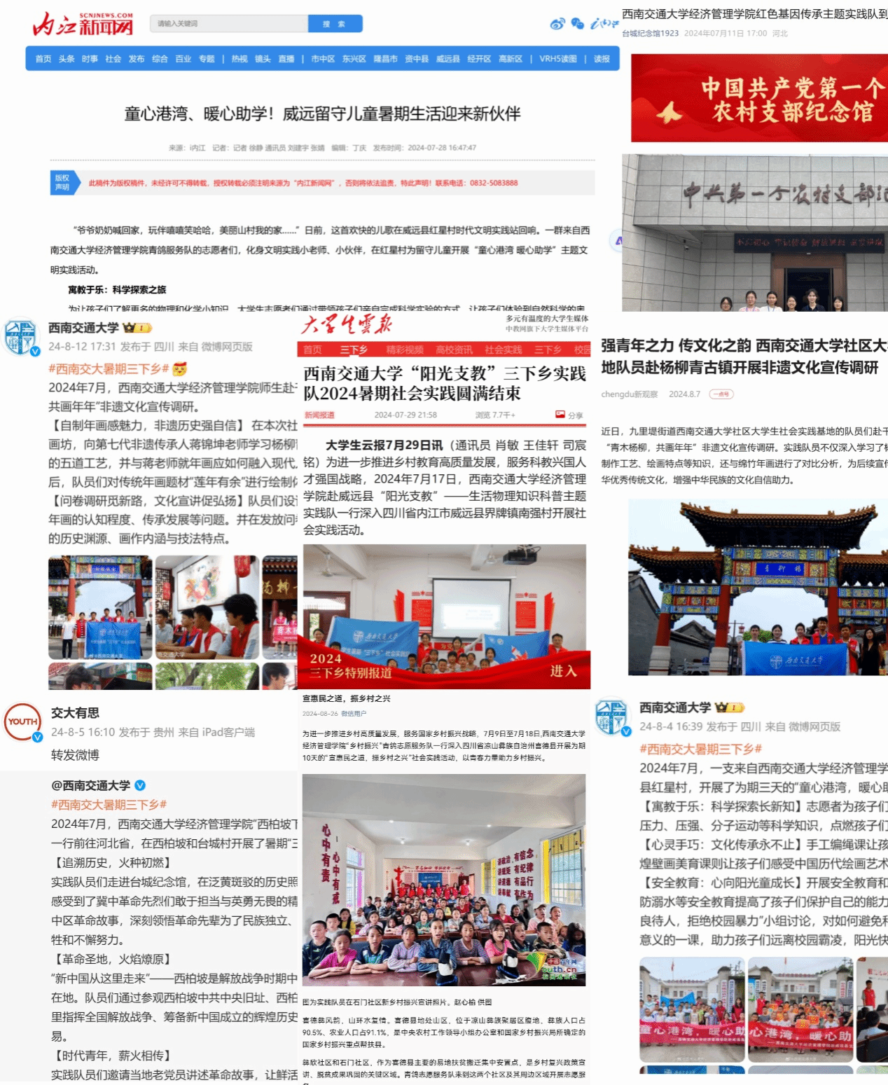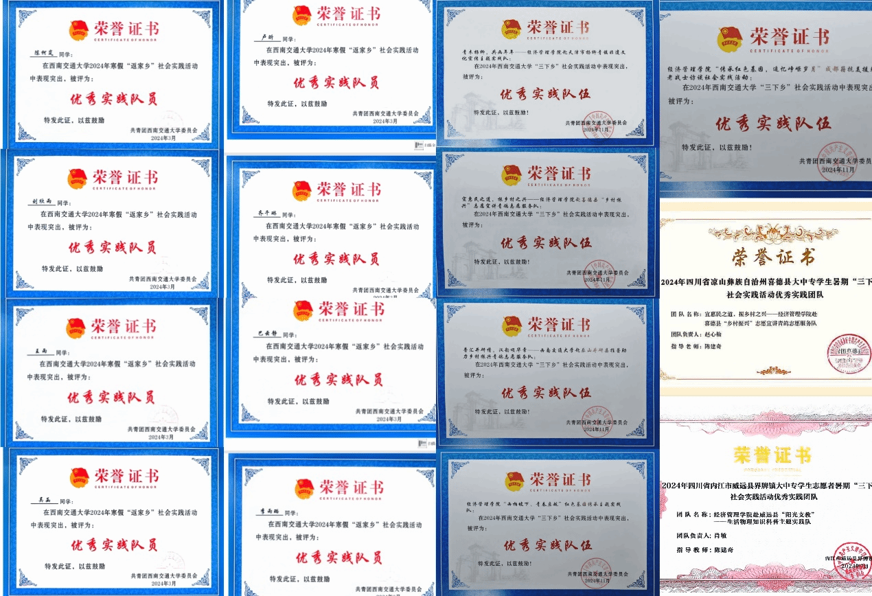 学院8支队伍获评学校寒、暑假社会实践优秀队伍,36名同学获优秀实践队员,6名老师获学校共青团实践育人优秀指导教师,收到实践地反馈信、感谢信共计20余份。实践队伍获中青校园、中国大学生网、今日头条、中国共青团官方杂志、“三下乡”官方微博等国家级报道40篇,四川法制报、四川学联、四川共青团官方微博等省级媒体报道11篇,县、市级等其他报道总计81篇。实践活动受到了社会的广泛关注,取得了积极的社会影响。同时,总结、表彰、宣传,树立典型,强化新葡的京官网实践育人成效,先后发布新葡的京官网实践队伍风采展新闻及推送6篇,展现了交大经管学子的良好风貌。