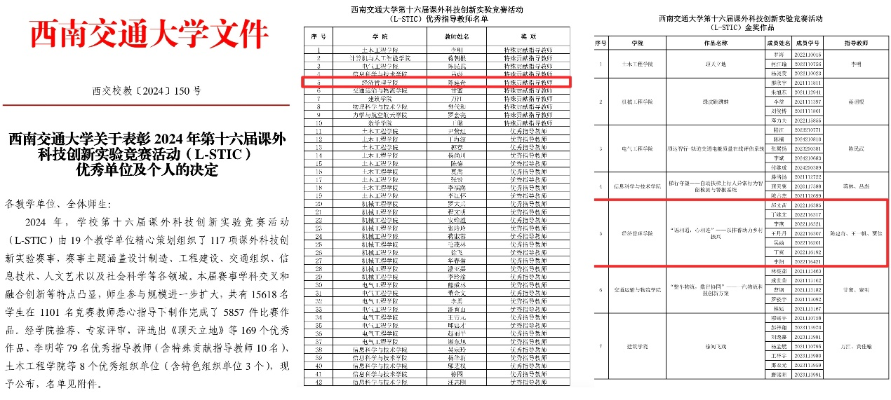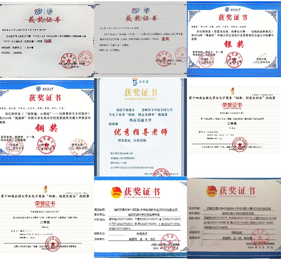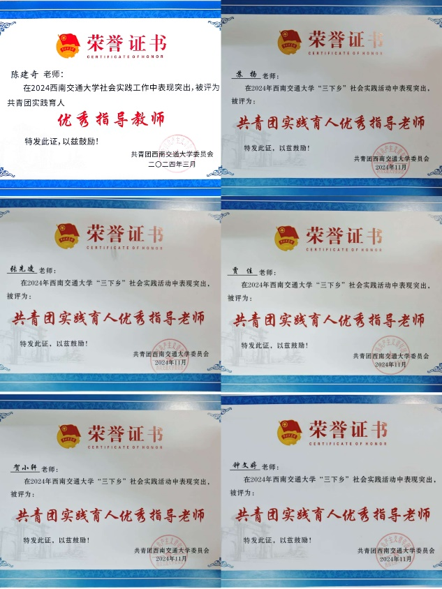 2024年“青鸽志愿服务队”培育孵化的“有爱助无碍,执善而为善——助残扶弱新模式”“语相通,心相连——以推普助力乡村振兴”系列实践项目分别荣获第十四届“三创赛”四川省赛“二等奖”、“三等奖”;“挑战杯”校赛“银奖”、“铜奖”;中国国际大学生创新大赛校级“金奖”、“铜奖”。同时,“语相通,心相连——以推普助力乡村振兴”实践项目还被评选为新葡的京集团350vip8888官网第十六届课外科技创新实验竞赛活动(L-STIC)的金奖作品,指导老师陈建奇被评选为特殊贡献指导老师。