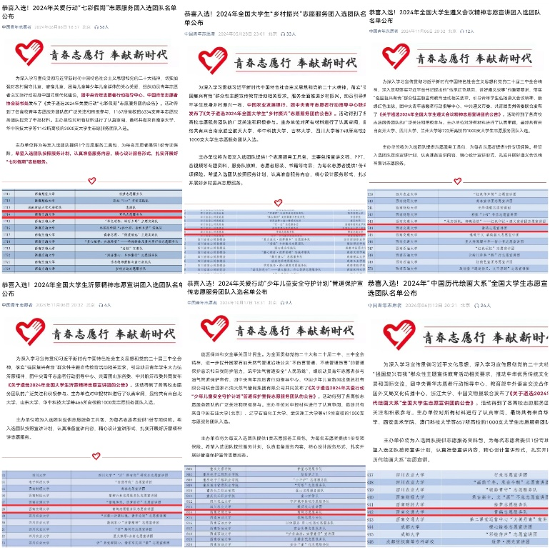 2024年,学院分别组织开展了“强国有我 青春有为”为主题的寒假“返家乡”和以“青春为中国式现代化挺膺担当”为主题的暑期“三下乡”社会实践活动,鼓励学生们积极参与志愿服务,投身社会实践。学院从前期的精心组织、周密安排到中期的督促指导、全面保障再到后期的宣传推广、交流互鉴,扎实推进每一步工作,取得了不错成效。