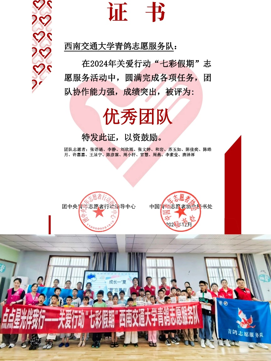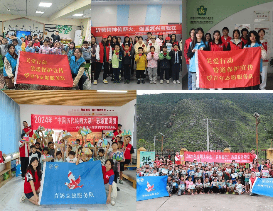 此外,“青鸽志愿服务队”还入选了六项2024年全国大学生专项志愿服务团,包括:关爱行动“七彩假期”志愿服务团,关爱行动“少年儿童安全守护计划”管道保护宣传志愿服务团,“中国历代绘画大系”全国大学生志愿宣讲团,全国大学生沂蒙精神志愿宣讲团,全国大学生遵义会议精神志愿宣讲团,全国大学生“乡村振兴”志愿服务团。其中,已经评出的“七彩假期”关爱行动志愿服务项目在众多参评团队中脱颖而出,荣获“优秀团队”。