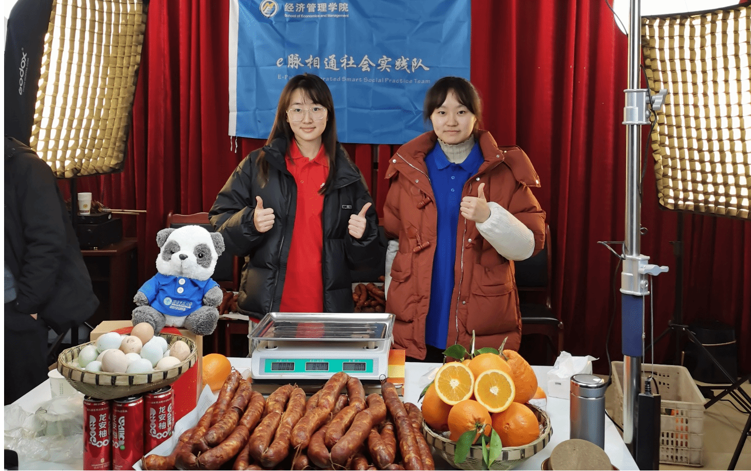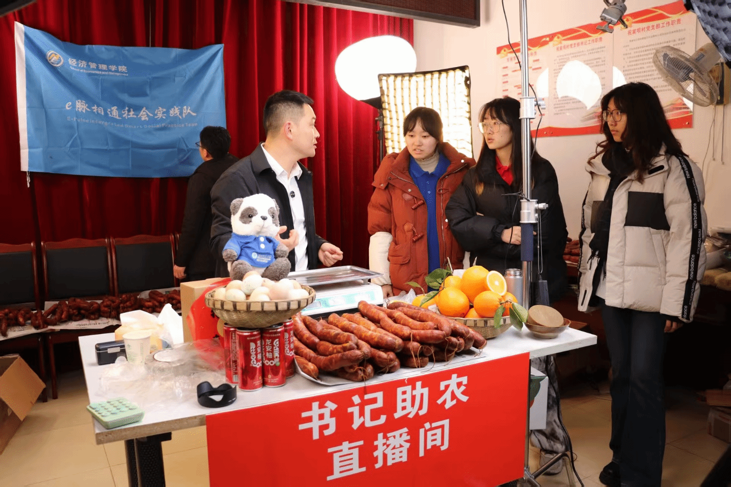 1月14日下午,实践队顺利与祝家坝村的邓支书和江主任会合。早在直播前数日,为确保直播效果,队员们就通过线上会议精心拟定直播脚本。抵达祝家坝村村委会后,队员们迅速投入到紧张的直播筹备工作中,协助工作人员有条不紊地布置直播场地、摆放香肠和邻水脐橙等特色农产品。