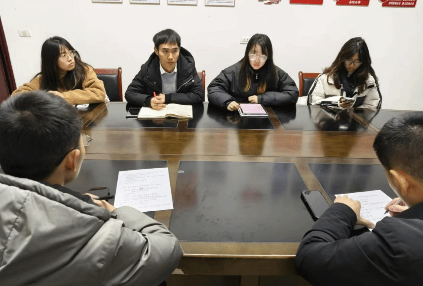 当晚直播前, “e脉相通”实践队围绕形成的直播优化方案与邓支书和江主任进行了交流讨论。会上,邓支书与江主任结合当地实际情况,讲述了乡村发展的现状、面临的挑战与未来规划,并向大家分享了自己的初心与使命。实践队成员则从自身专业视角出发,提出了诸多关于农产品品牌塑造、电商推广创新等方面的见解以及农产品推广策略、包装优化和物流跟进等方面的改进建议。双方畅所欲言,思维碰撞,为后续工作的开展奠定了坚实基础。