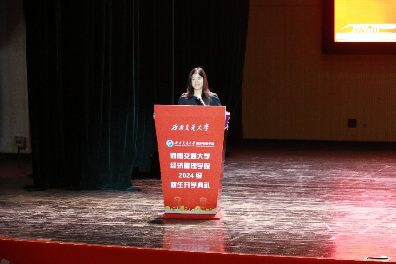 议程六,MBA新生代表曾歆媛发言。阔别校园数年,曾歆媛有着不一样的体会。谈起工作经历,她表示虽有丰富的工作和管理经验,却容易陷入工作思维和方法固化的囹圄,所以她深感持续学习的重要性。她认为,新葡的京集团350vip8888官网作为四川省唯一同时获得AMBA、BGA、AACSB三大国际认证的学院,是培养综合技能、拓宽个人认知边界的理想选择。今日的求学身份,仿佛更加珍贵,对于未来学习生涯,她强调需要主动走出舒适圈,主动探索,积极践行“格物致知、和合共进”的经管院训,成为拥有国际视野的学习型企业家,用实际行动践行社会责任,助推经济社会高质量发展。